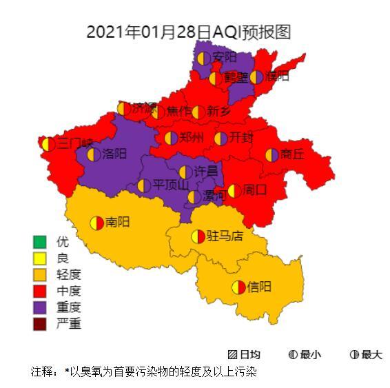 据省生态环境监测中心预测,未来7天,受静稳高湿和区域污染传输等影响,我省空气质量相对较差。21日至28日,全省大部分地区有中度及以上污染过程。尤其是22日至23日,全省大部分地区会出现中度至重度污染过程。为尽可能减轻污染峰值,减少重度至严重污染持续时间,省污染防治攻坚办下发《关于启动重污染天气红色预警的紧急通知》,根据要求,郑州、开封、洛阳、平顶山、安阳、鹤壁、新乡、焦作、濮阳、漯河、许昌、三门峡、南阳、济源于1月22日12时前启动了重污染天气红色预警,信阳、商丘、周口、驻马店已于1月22日10时启动了重污染天气橙色预警。