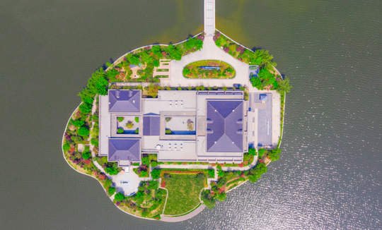 金明池“智慧岛”位于开封示范区黑岗口调蓄水库核心位置,主体建筑群面积6万平方米,包括“一苑两中心”:
