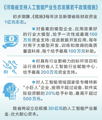 “由人工智能引领的‘数智’浪潮,正转化为河南经济增长的强劲动能。《措施》作为夯实实体经济根基、推动高质量发展的实际行动,我们将持续跟进完善操作流程,专班专责加快落实,确保各项政策红利精准滴灌到企业发展的关键环节。通过坚持创新与应用并重,吸引国内外优质企业、项目和人才集聚,努力构建具有影响力的人工智能创新策源地和产业高地。”省发展改革委有关负责人说。(本报记者宋敏)