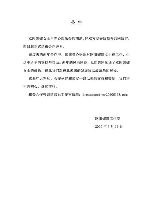 【欧阳娜娜与壹心娱乐结束合作】继张雨绮、陈数、张艺兴之后,欧阳娜娜也与壹心娱乐合约期满。6月16日,欧阳娜娜工作室发表声明表示,欧阳娜娜与壹心娱乐经双方友好协商并共同决定,即日起正式结束合作关系,并感谢壹心过去两年时间里给予的支持和帮助。声明中写道,“在过去的两年合作中,感谢壹心娱乐对欧阳娜娜女士在工作、生活中的支持与帮助。两年的风雨同舟,我们共同见证了欧阳娜娜女士的成长,在此我们对彼此的发展致以最诚挚的祝福。”在此之后,壹心娱乐也转发此微博并写道“两年风雨同舟,感谢Nabi的信任与支持,祝福未来越来越好,加油”。目前壹心娱乐合作艺人还有朱亚文、马伊琍、宋佳、李现、白宇、马思纯、春夏等。