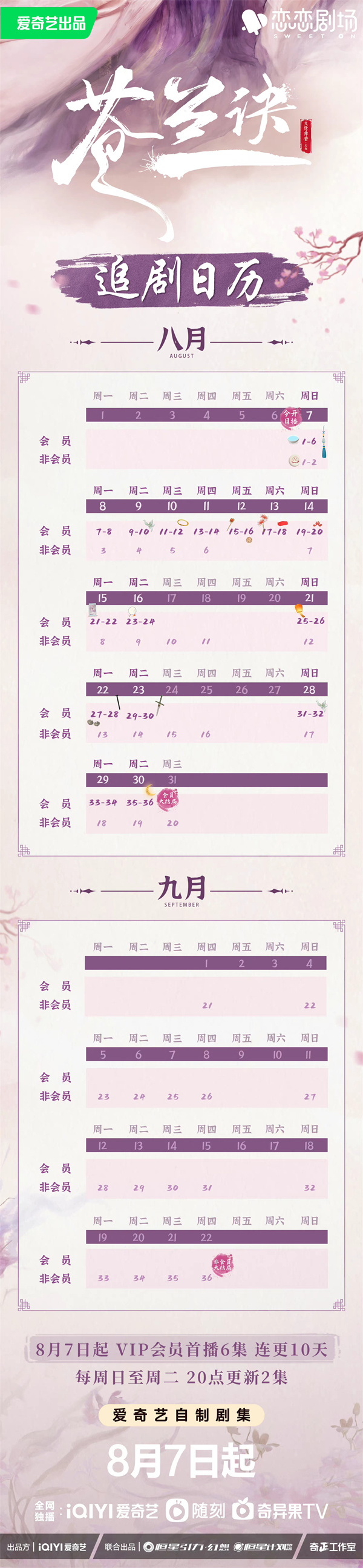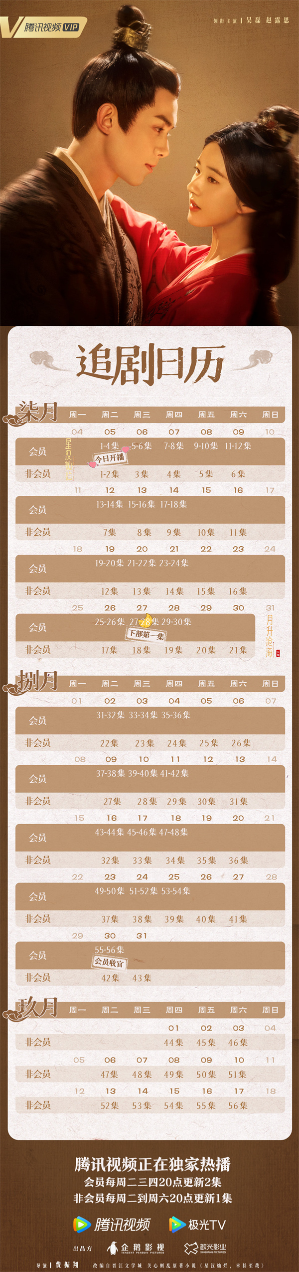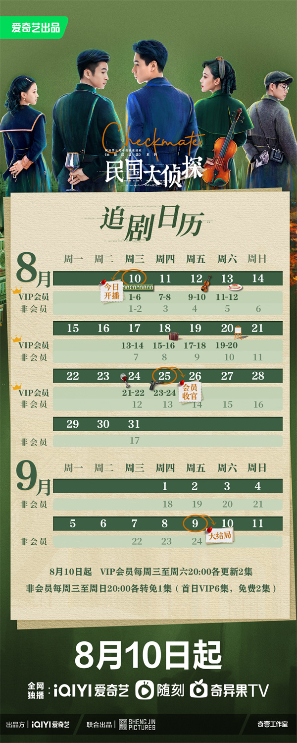 追剧日历:2022年8月11日18:00上线,首周VIP首更更新4集,周五至周日每日更新1集,非VIP首更周四至周六每日更新1集,次周起周一至周五,VIP每日更新1集,非VIP周一至周三每日更新1集