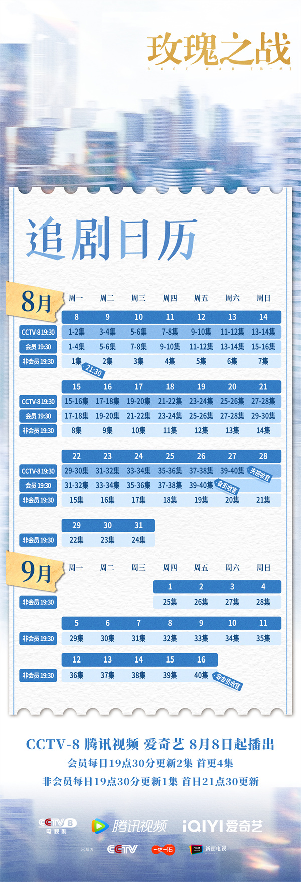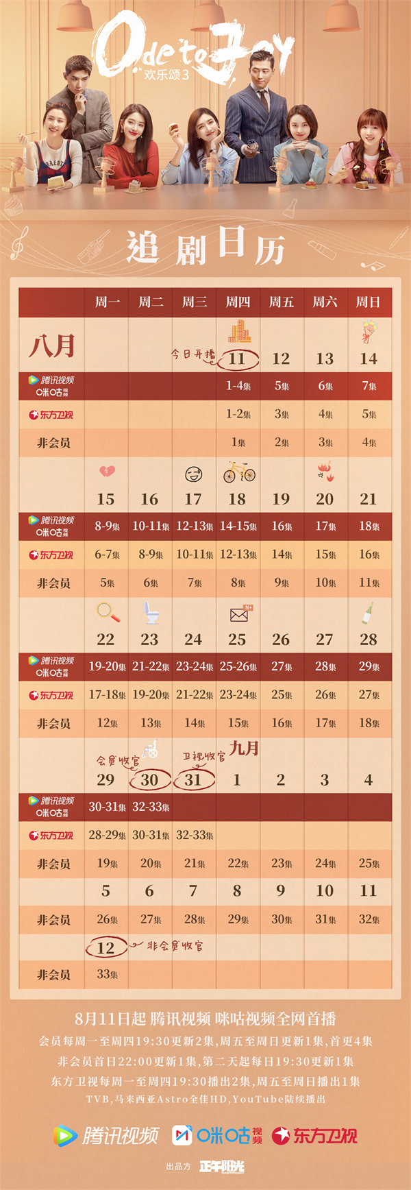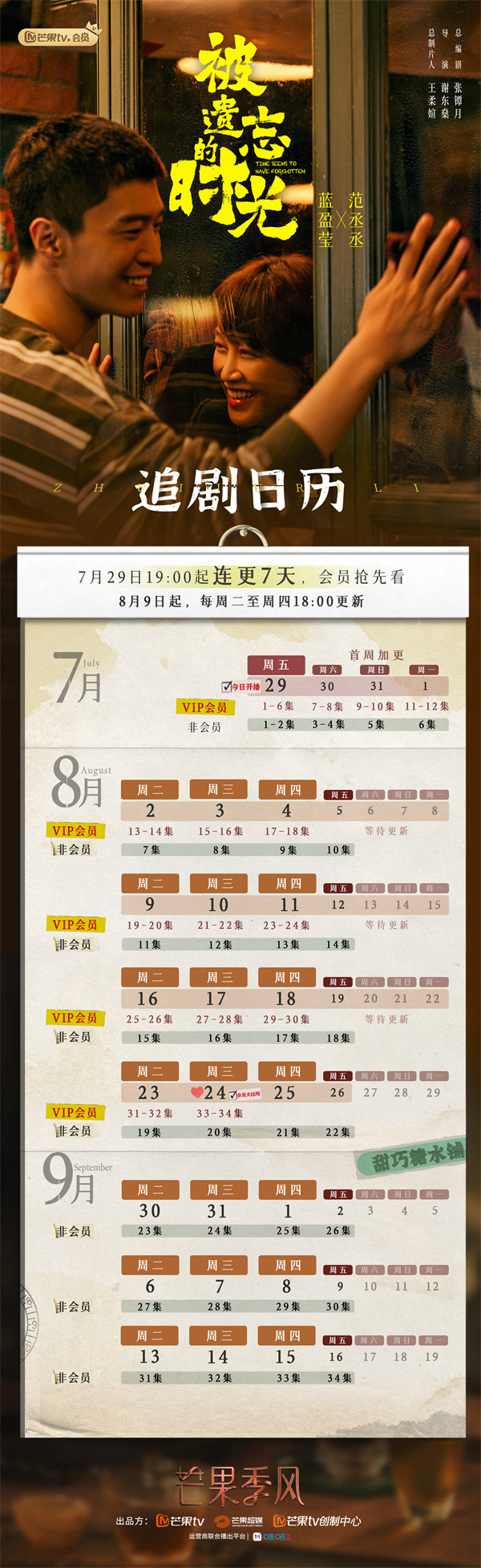 追剧日历:2022年8月11日18:00上线,首周VIP首更更新4集,周五至周日每日更新1集,非VIP首更周四至周六每日更新1集,次周起周一至周五,VIP每日更新1集,非VIP周一至周三每日更新1集