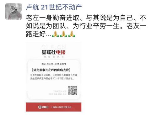 21世纪不动产中国区总裁兼CEO卢航发文说,“老左一生勤奋进取,与其说是为自己,不如说是为团队、为行业辛劳一生。老友一路走好……”