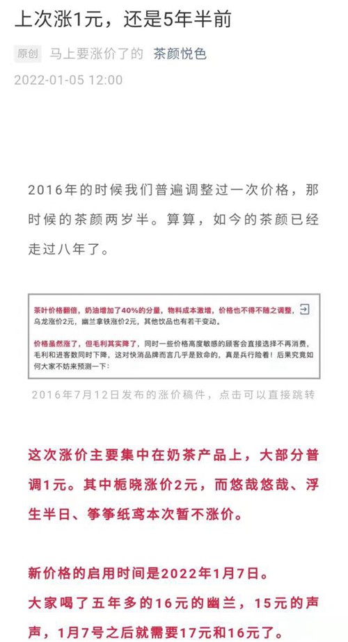 在2016年的涨价通知中,茶颜悦色将涨价原因归结为“茶叶价格翻倍,奶油增加了40%的分量,物料成本激增”,对此,声声乌龙涨价2元,幽兰拿铁涨价2元,其他饮品也有若干变动。茶颜悦色随后表示,“价格虽然涨了,但毛利其实降了”。就在去年年底,茶颜悦色曾因员工薪资问题引发争议,在聊天群中上演了一出老板亲自下场开撕员工的闹剧,创始人吕良之后在公司内部发表道歉信,茶颜悦色官方微博发布员工薪资算法调整的说明,并称已向相关员工道歉。