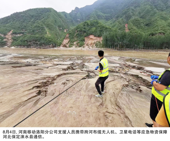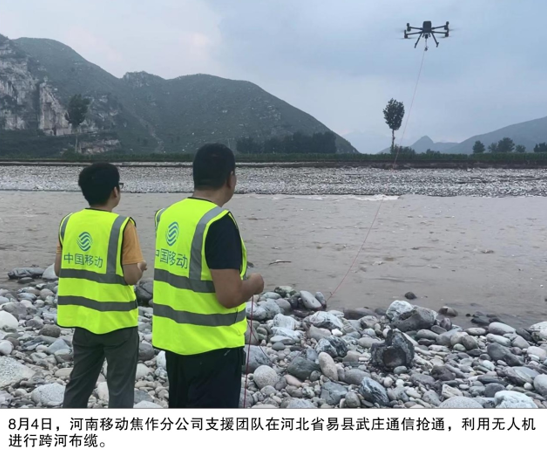 在河北保定涞水县,河南移动洛阳分公司也第一时间利用无人机进行布缆,协助对宋各庄、悟空寺接入网光缆进行布放,修复赵各庄汇聚传输线路,恢复基站累计19个,为方圆10公里以内村民及当地防汛指挥及时提供通信保障。