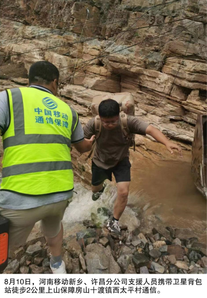 8月5日,河北张家口涿鹿县有三个村子与外界失联近一周,河南移动郑州分公司临危受命,派遣王海锋、刘凯、杜森三人携带卫星背包站驱车抢修。山路被洪水淹没,王海峰就拍着方向盘说“开不了车?我们背也要把设备背到村里!”三个人、三个村、三个多小时,全程30公里,50斤的卫星背包站压在他们身上,在黑暗中快速调通设备,迅速抢通通信信号。“山上失联老人打通电话报平安的一刻,觉得这一路的艰难跋涉都值得,这就是移动通信工作的意义吧。”河南移动郑州分公司支援队员表示。