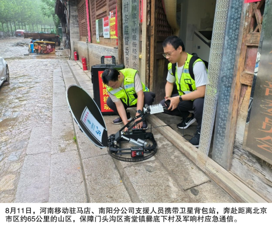 “没有车道,我们人工搬运设备;雨天路滑,我们就携手前行……”崔松、杨忠齐相互打气,他们克服因道路被冲毁,车辆无法进入等困难,用肩扛、背驮的方式携背包基站、卫星电话、笔记本电脑等装备在坑洼难行的路面徒步前行,将卫星电话送到十渡镇应急指挥部,并通过卫星背包站在20分钟内建立了应急卫星通信网,提供了手机网络和WIFI信号,为现场应急调度和村民临时搭建了一个对外紧急通信环境,有力支撑当地网络畅通。