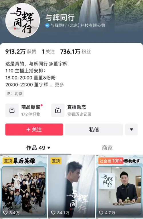 截至1月9日23点,“与辉同行”粉丝数量已达712.5万人,而1月8日23点,该账号粉丝数量为385.2万人。也就是说,“与辉同行”24小时涨粉327.3万人。