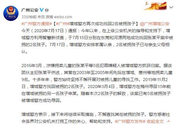 【警方再找回2名梅姨案被拐儿童】广州增城公安今天(2020年7月17日)通报:今年以来,在上级公安机关的指导和支持下,增城警方利用智慧新侦查,于7月15日分别在东莞和河源两地成功找回张某平案中被拐的2名孩子。7月17日,增城警方安排家属认亲,2名被拐孩子已与亲生父母相认。