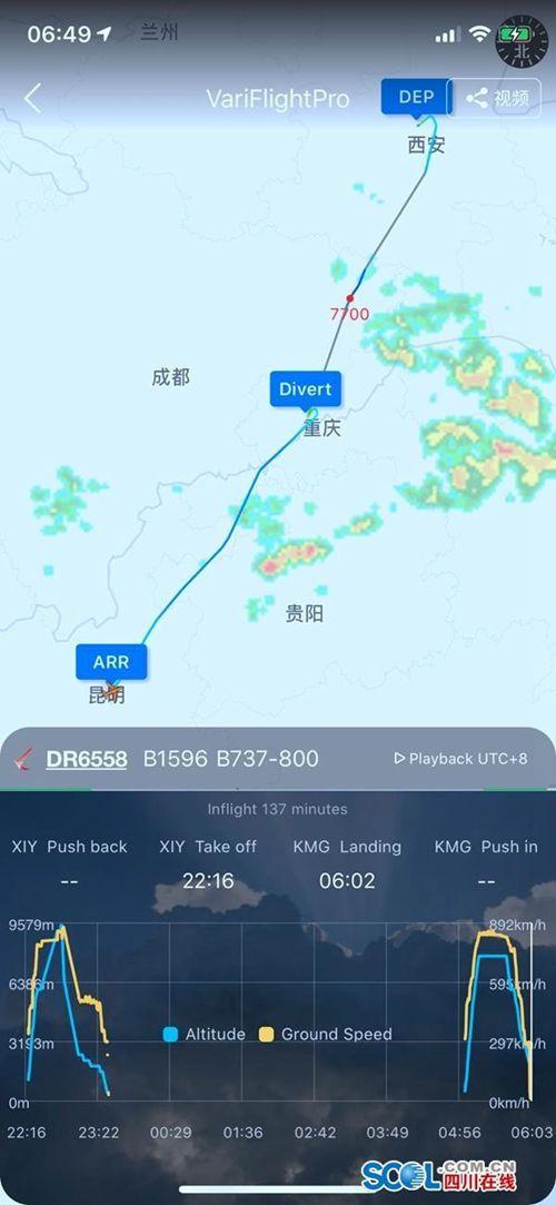 今天凌晨,瑞丽航空紧急调集了另一架飞机,5时许搭载备降航班DR6558的178名旅客从重庆江北国际机场起飞,6时许平安抵达昆明长水国际机场。(图据“飞常准”)