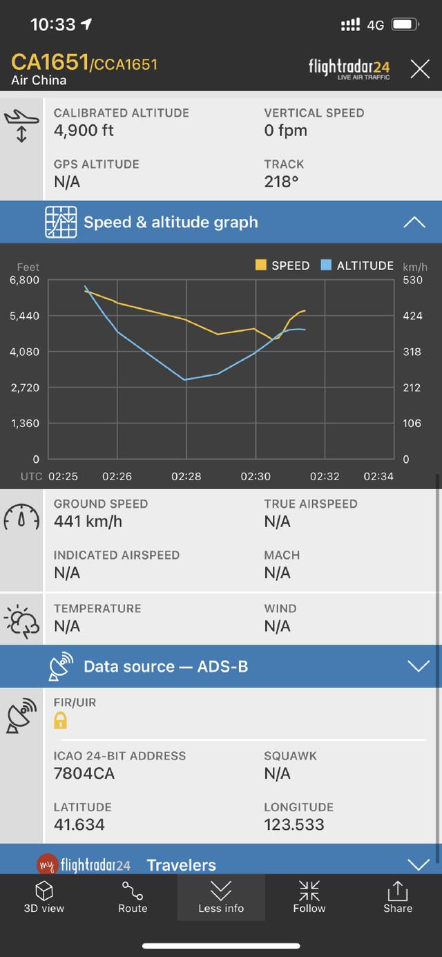 【国航一北京飞往沈阳航班返航】据飞常准APP显示,10月21日,中国国航由北京首都飞往沈阳桃仙的CA1651正在返航,原因尚不明。