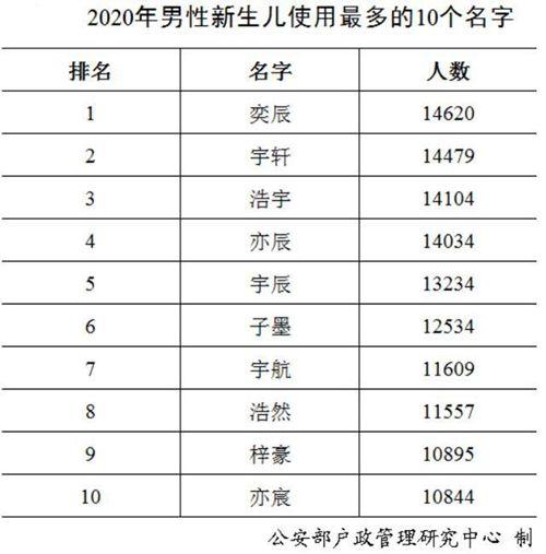 2020年出生并已经进行户籍登记的男性新生儿中,使用频率最高的10个名字依次为:“奕辰”“宇轩”“浩宇”“亦辰”“宇辰”“子墨”“宇航”“浩然”“梓豪”“亦宸”。与2019年相比,“奕辰”首次入围并登顶榜首,成为男性新生儿父母起名的首选,“亦辰”“宇辰”“亦宸”也进入前十。