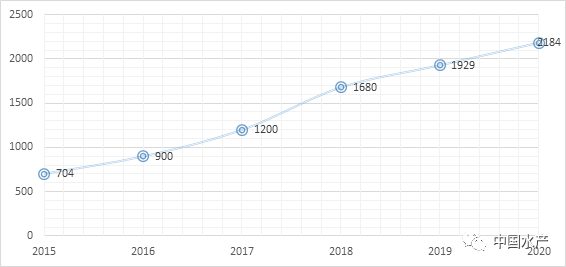 图2:2015~2020年小龙虾养殖总面积曲线图(单位:万亩)