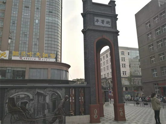 而平等街西侧一个小游园,其中的文化墙上展示有这条街道曾经的过往,图文并茂,而最抢眼的则是一座比较高大的青红相间的充满民国风味的建筑,在其后侧则是曾经的一户深宅大院,如今重修的小门楼和“克遵瑞风”牌匾仍能让人相信其当年的辉煌。