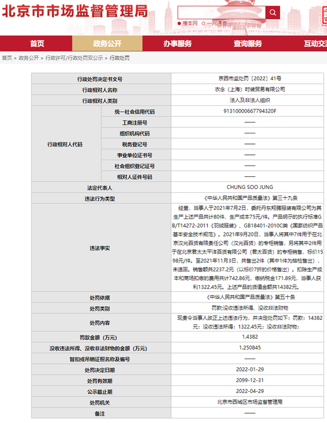 【标价1500的羽绒服成本仅75】北京市市场监督管理局网站公布的行政处罚决定书(京西市监处罚〔2022〕41号)显示,衣念(上海)时装贸易有限公司因羽绒服以次充好,被北京市西城区市场监督管理局罚款14382元,并没收违法所得1322.45元。