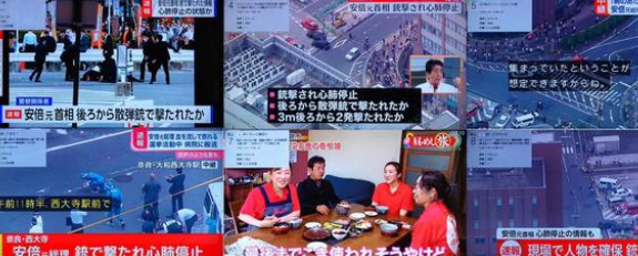 【东京电视台仍在播美食节目】当地时间8日11时30分许,正在日本奈良市进行街头演说的日本前首相安倍晋三遭枪击倒地。随后,有网友发现,东京电视台仍然在播放美食节目。除了东京电视台外,其他电视台都在播报安倍中枪一事,这是7月8日,日本广播协会电视台NHK报道。