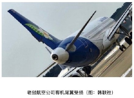 仁川国际机场方面称,一架等待起飞的老挝航空公司飞机的尾翼与韩国廉价航空(Air Premia)一架飞机的右翼刮擦。从韩联社曝光的现场画面来看,老挝航空公司客机尾翼受损,尾翼有部分被刮掉。