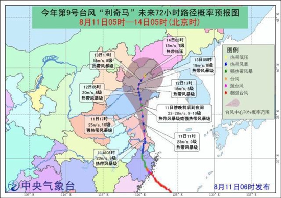 风王“利奇马”在浙江登陆后持续北上。11日早6时,中央气象台继续发布台风黄色预警。