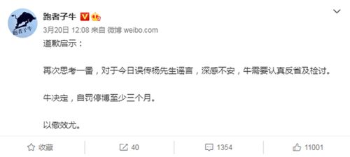 当日12点多,@跑者子牛又发布了一则“道歉启示”表示,其再次思考一番,“对于今日误传杨先生谣言,深感不安,牛(自称)需要认真反省及检讨。牛决定,自罚停博至少三个月。以儆效尤。”