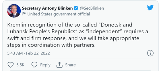 布林肯宣称:“克里姆林宫承认所谓的‘顿涅茨克人民共和国’和‘卢甘斯克人民共和国’独立,需要(对此)做出迅速而坚定的回应,我们将与合作伙伴协调采取适当措施。”
