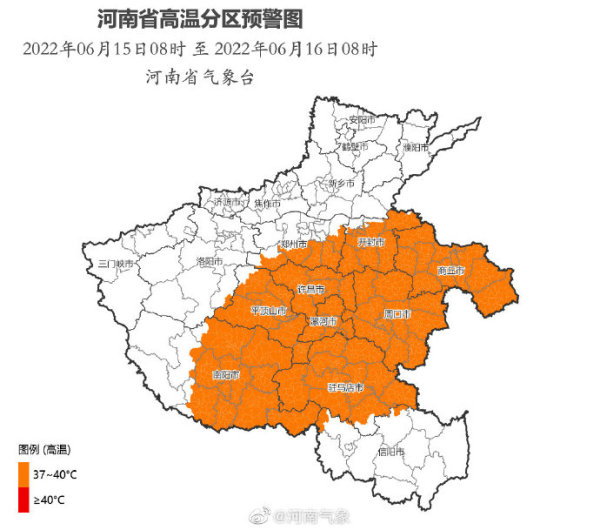 河南省气象台2022年06月14日11时00分发布高温橙色预警:预计6月15日白天,洛阳(汝阳县)、郑州(中牟县,航空港区,新密市,新郑市,登封市)、开封、商丘、平顶山、许昌、漯河、周口、南阳(宛城区,卧龙区,南召县,方城县,镇平县,内乡县,社旗县,唐河县,新野县,桐柏县,邓州市)、驻马店、信阳(平桥区,息县)最高气温将升至37℃以上。