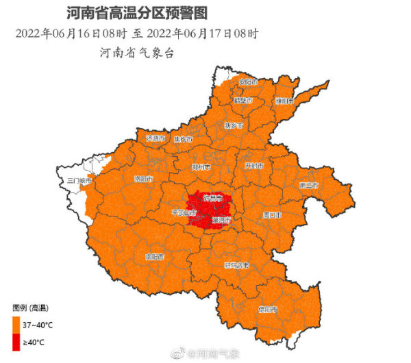 6月16日白天,安阳、鹤壁、濮阳、新乡、济源、焦作、三门峡(陕州区,渑池县,卢氏县,义马市,灵宝市)、洛阳、郑州、开封、商丘、平顶山、许昌、漯河、周口、南阳、信阳、驻马店最高气温将升至37℃以上,其中平顶山(新华区,卫东区,湛河区,宝丰县,叶县,鲁山县,郏县,高新区,城乡一体化示范区)、许昌(魏都区,建安区,襄城县,禹州市)、漯河(源汇区,郾城区,舞阳县,临颍县)最高气温将升至40℃以上。请注意防范。