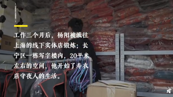 【00后小伙做寿衣店守夜人】00后男孩杨阳,在一家殡葬用品网店工作,负责看守寿衣仓库。因为寿衣大多是临时紧急购买,他需要一个人吃住在店里,接到订单后以最快的速度发货,或者打车送去。杨阳说,有一些客户会觉得晦气,他能做的就是,用真诚打动别人。
