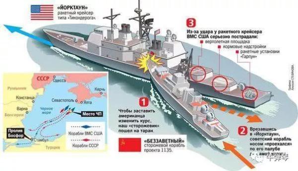 当时,美国海军约克城号巡洋舰和卡隆号驱逐舰闯入黑海,宣示所谓的自由航行权,这遭到苏联海军的强烈抗议。在警告无果后,两艘苏联战舰,随即果断撞向美舰!