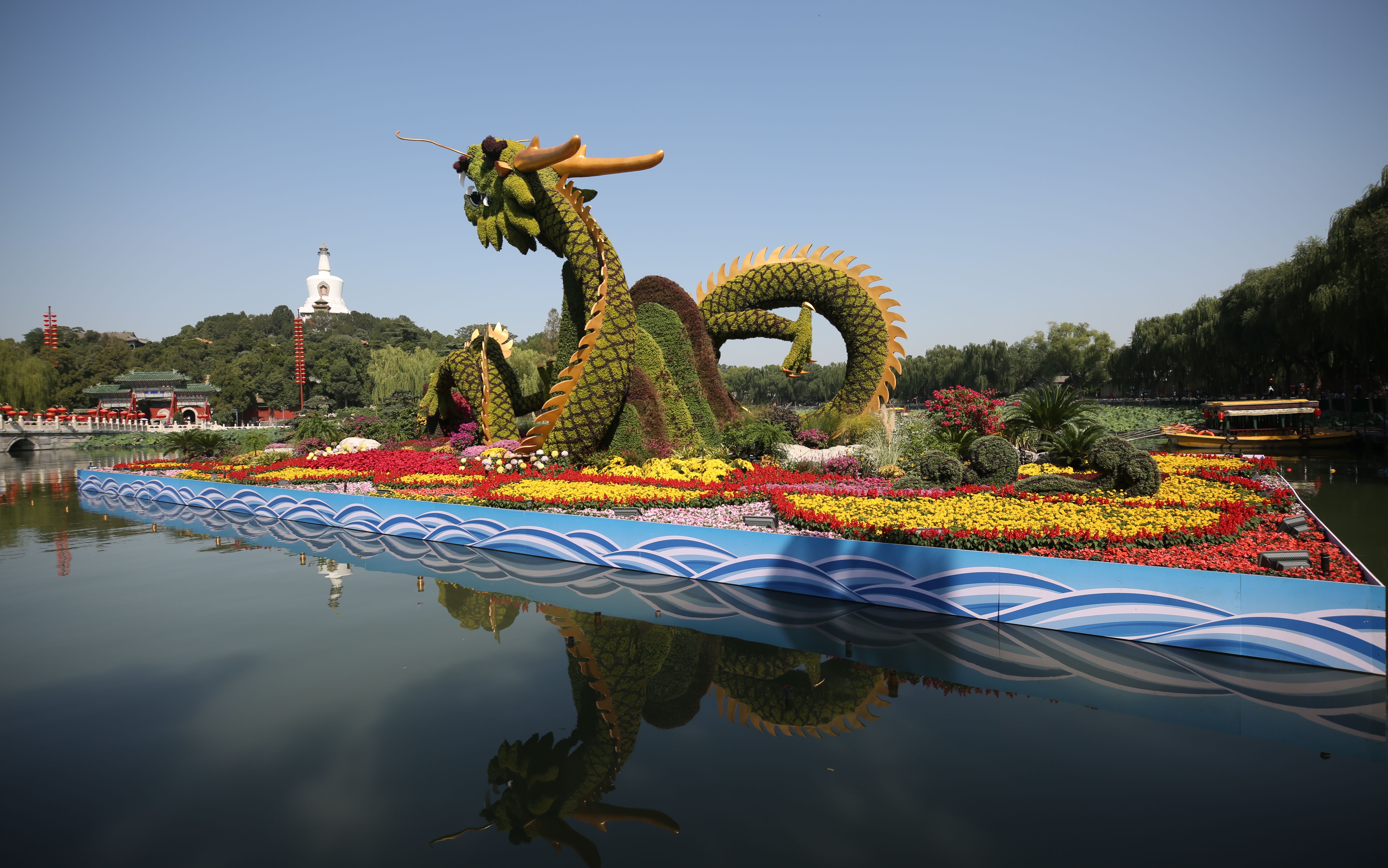 北海公园南门荷花湖的“龙腾盛世”主题花坛。北京市国庆游园指挥部供图