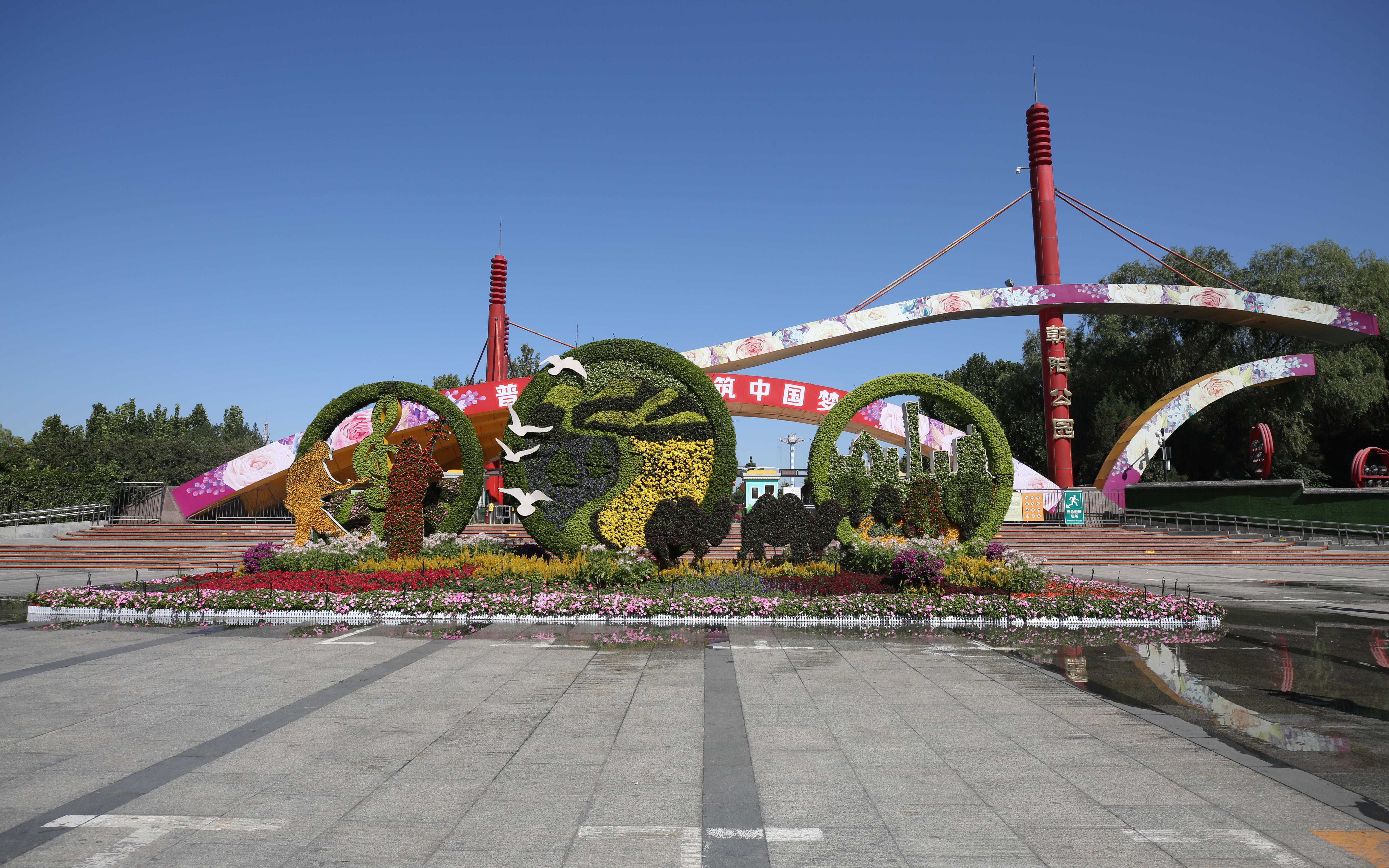 在公园东门,“花团锦簇迎国庆,科技乐享赞盛世”主题花坛十分瞩目,寓意着以科技为桥梁,搭建起未来绿色家园,人们在幸福的路上迈步前进。